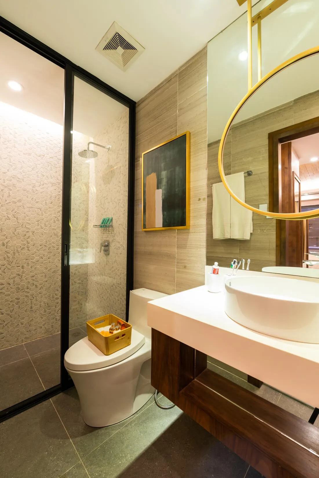 ◼ Toilet & Bath: Porcelain tiles, rain shower, double flush water closet