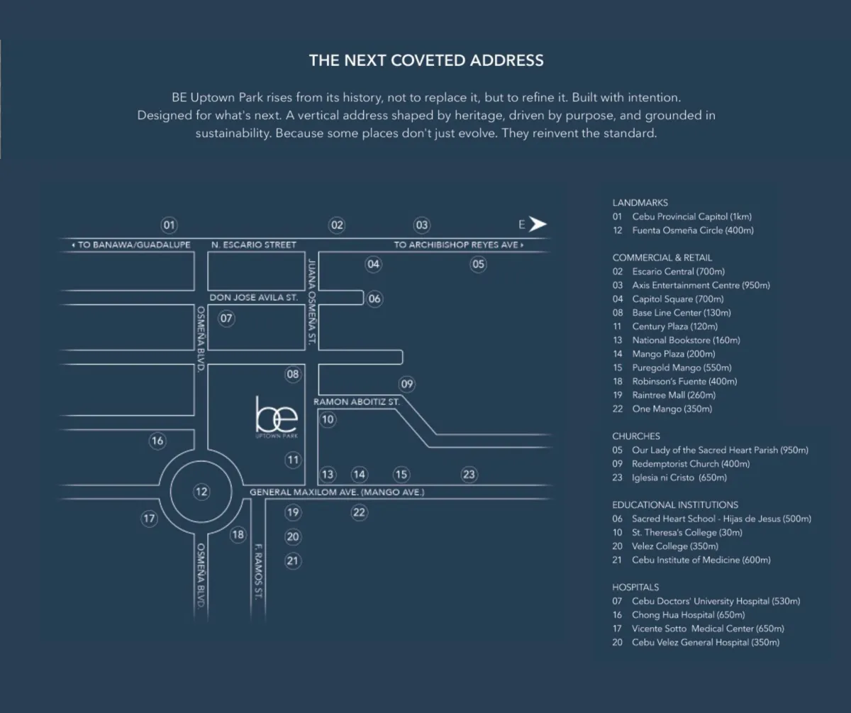 BE Uptown Park is centrally located in one of Cebu City’s most dynamic districts, giving residents direct access to business centers, lifestyle destinations, healthcare facilities, and top universities.